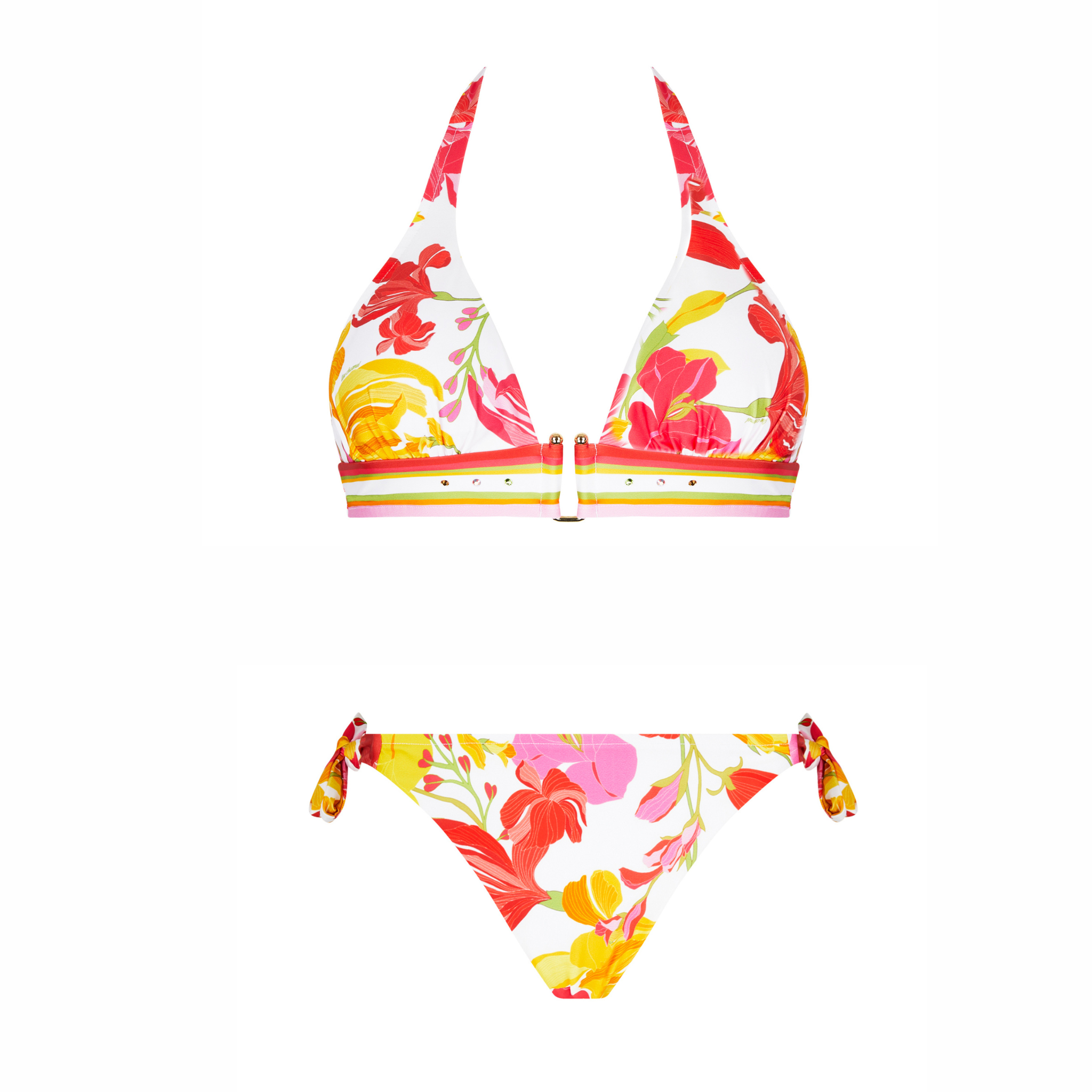 The Envolee Florale triangle shines with a lively floral print in sunny yellow, pink, and orange on a fresh white base. Its top comes with adjustable halter straps for the perfect fit, while the briefs sport slim tie sides that you can tweak just how you like. We??e totally smitten!