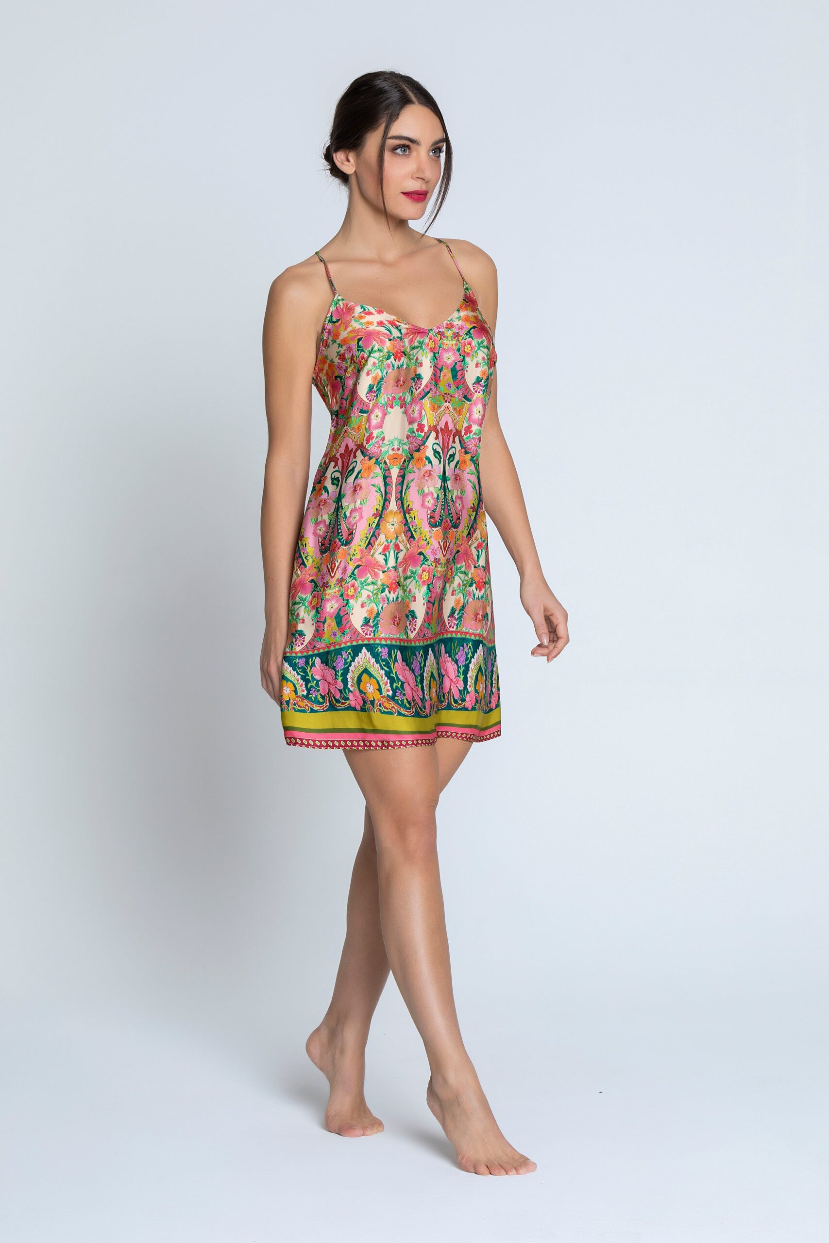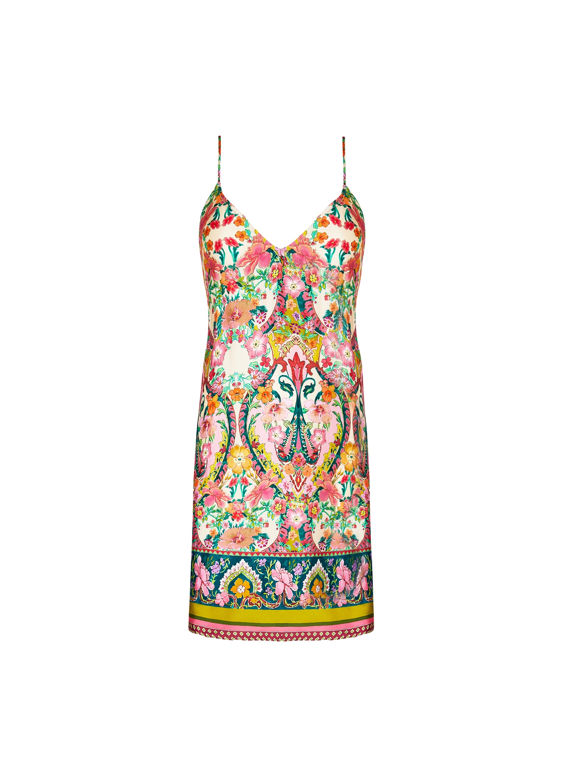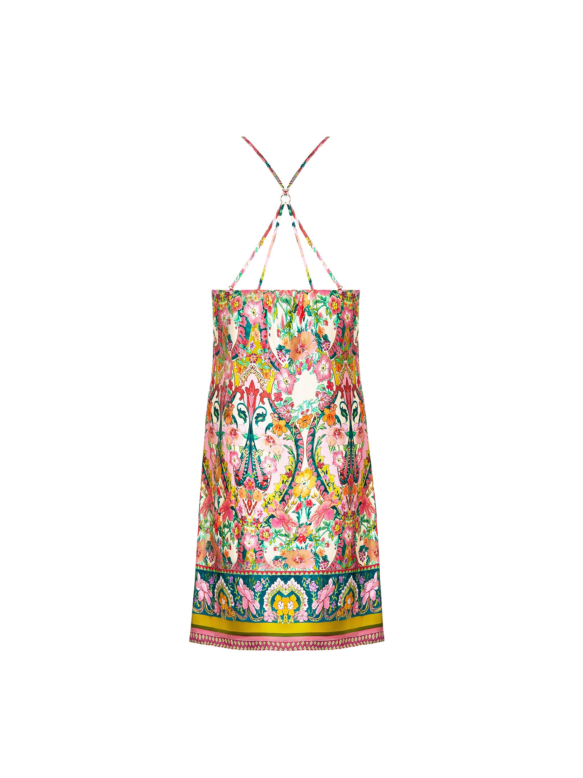 Experience true luxury with the Libertine En Fleurs nightdress. This stunning and sophisticated nightdress features an exquisite floral print in shades of pink, turquoise, and ochre. Adorned with delicate, slender straps and a flared hemline, it exudes elegance. The knee-length design boasts a beautiful border at the front and back hem, with intricately crossed straps at the back.